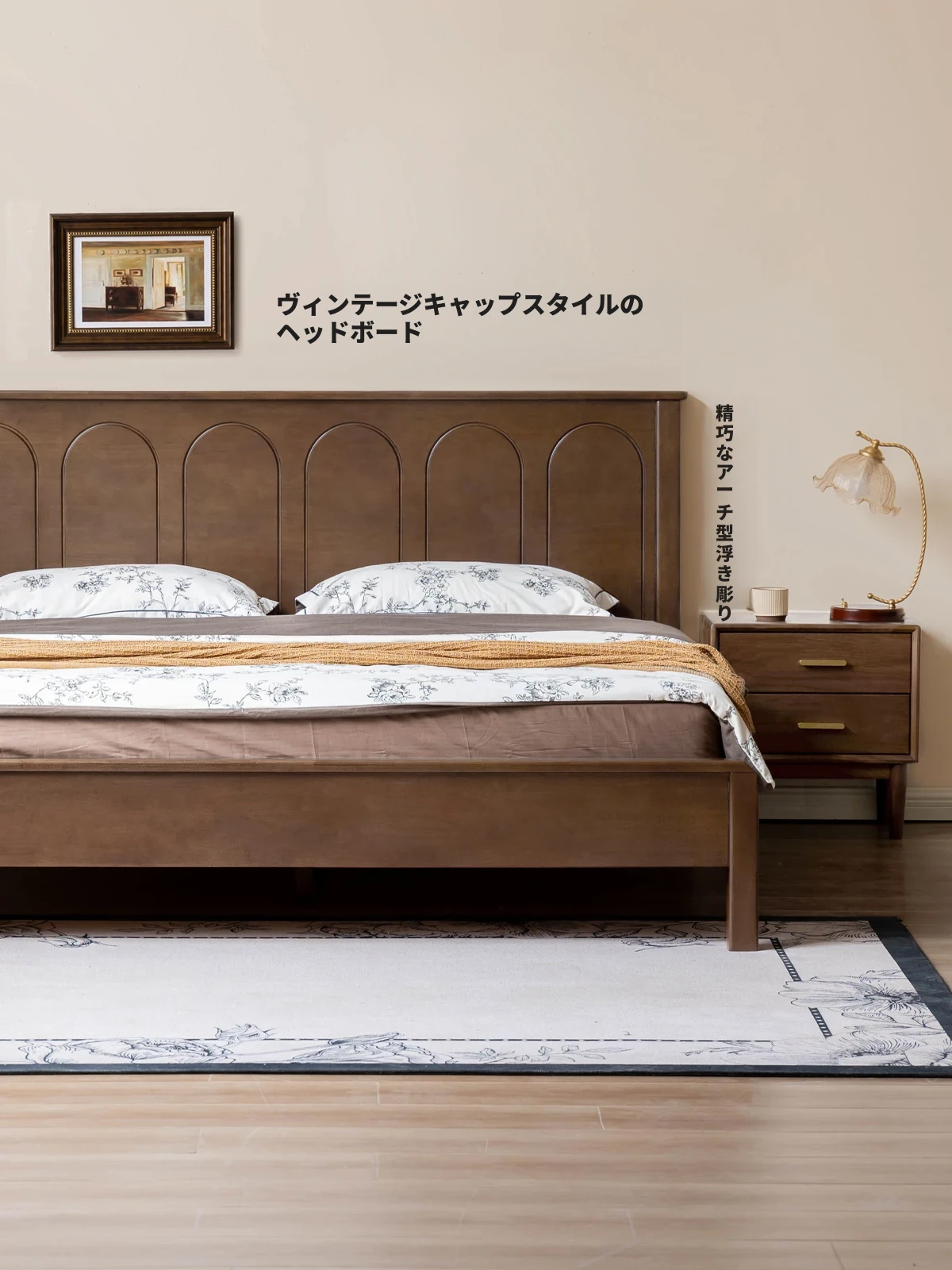 【注目】源氏木语x维莎 無垢材ベッド:アメリカンヴィンテージスタイル!家庭用高背もたれ、ウォールナット色のダブルベッドで贅沢な主寝室を演出。