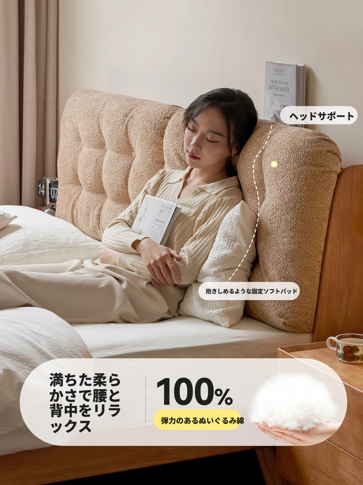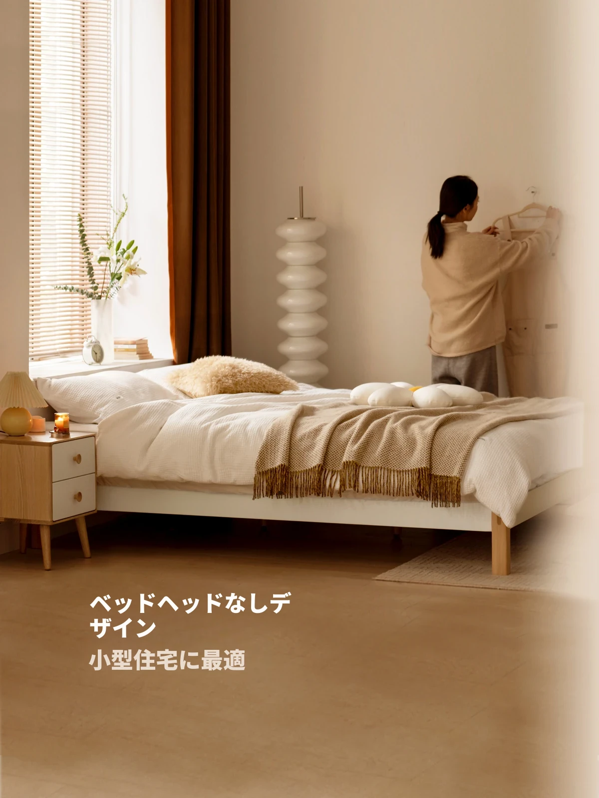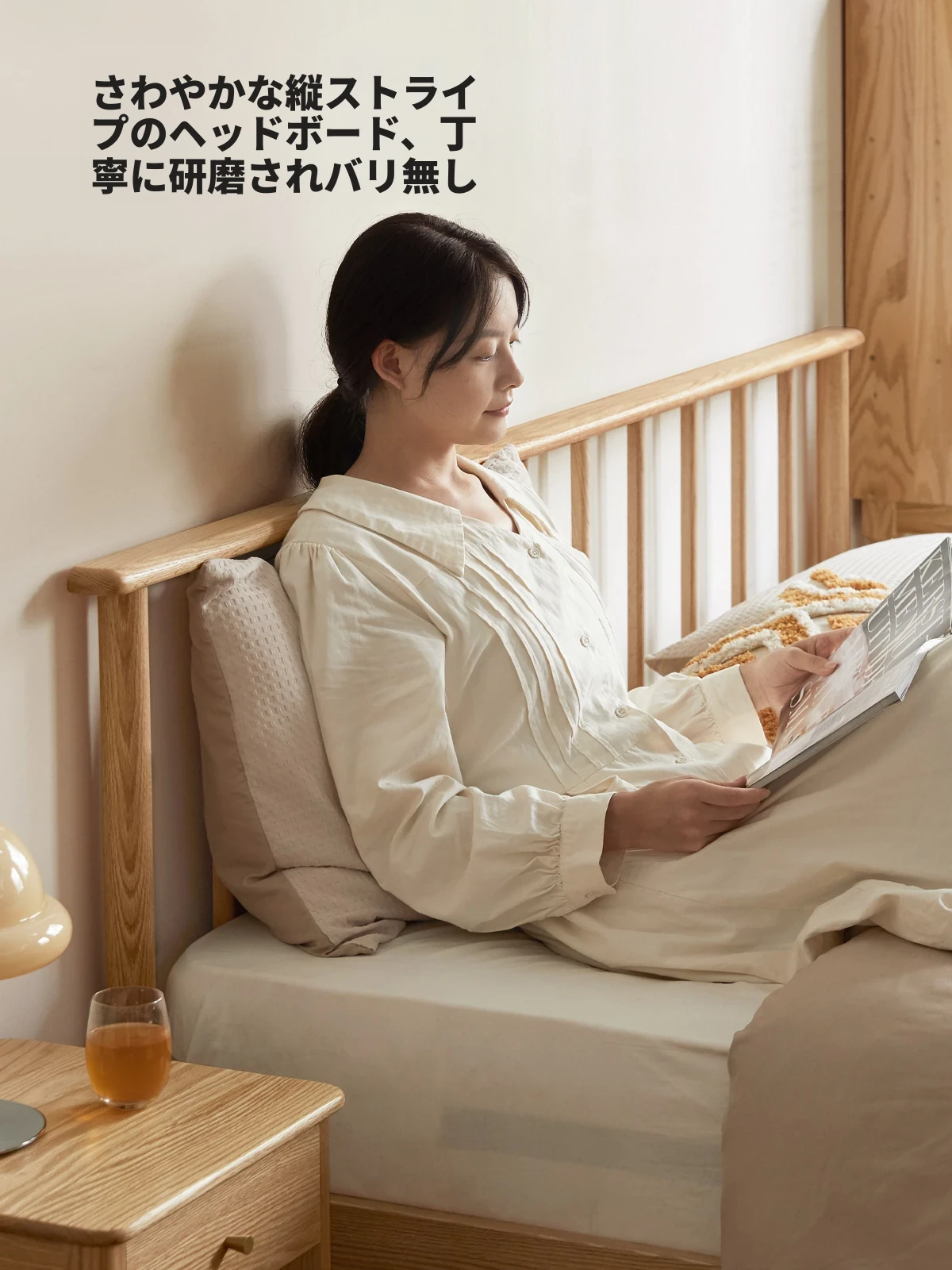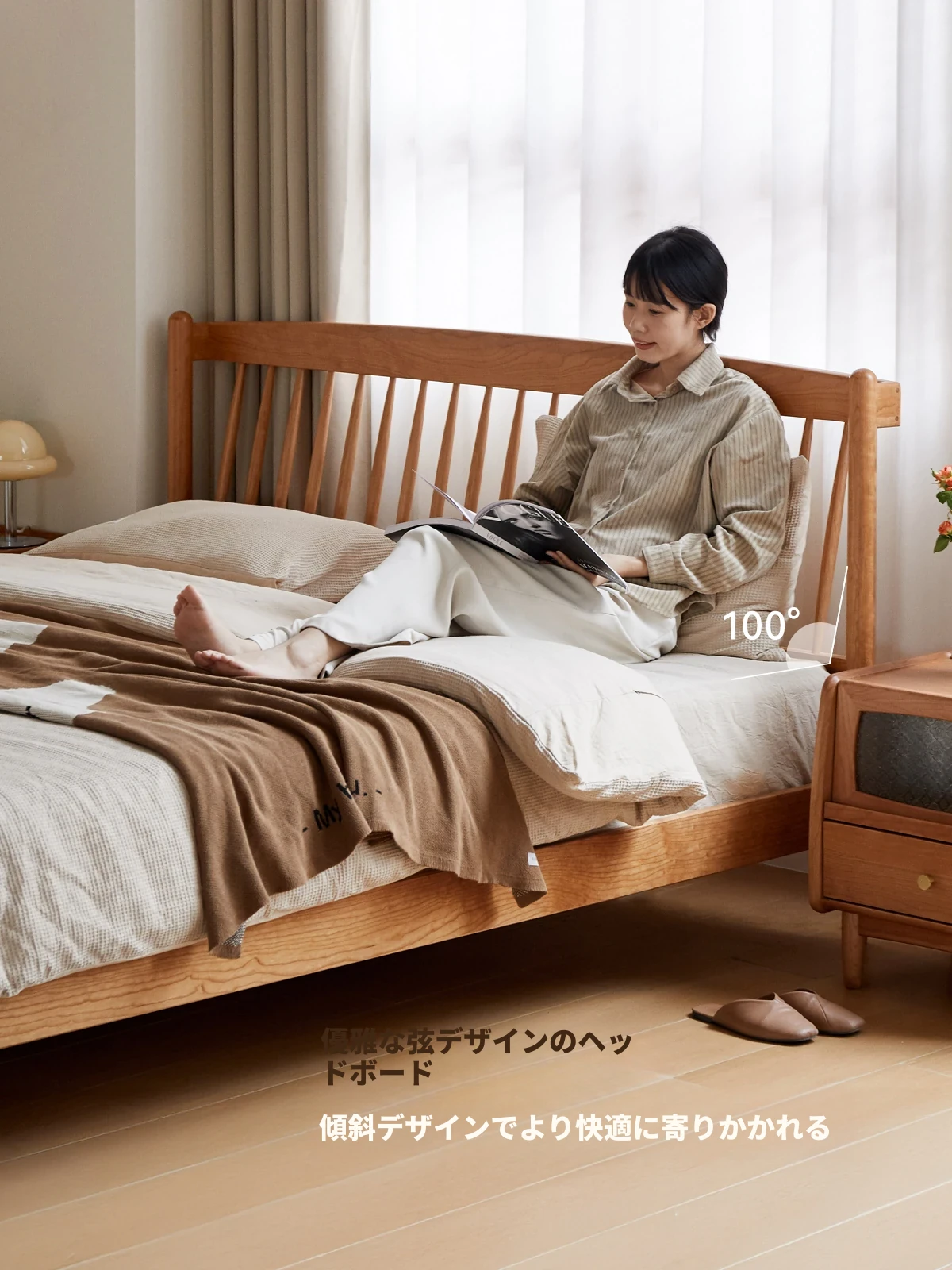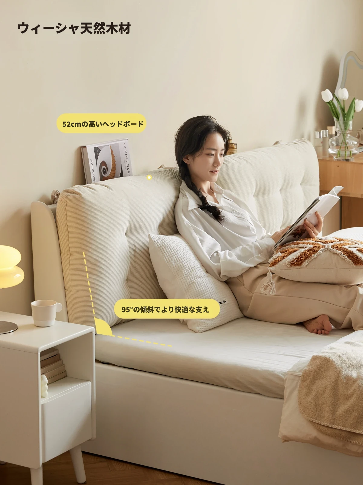 【魅力の木製家具】ゲンジモクユーxヴィサ純天然無垢材ベッド - クリームホワイトのハープ風デザインで、エレガントなお部屋にぴったり!快適なハープ型ソフト背もたれ付きで、主寝室に特別な安らぎを。