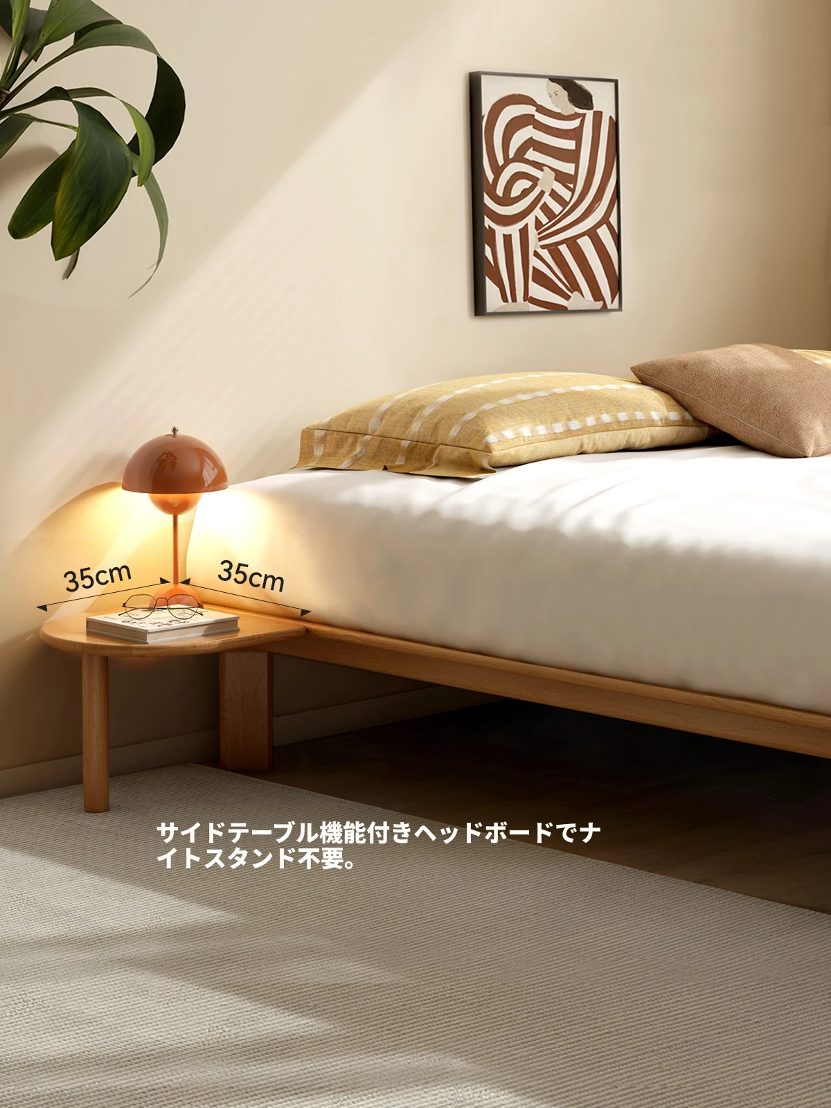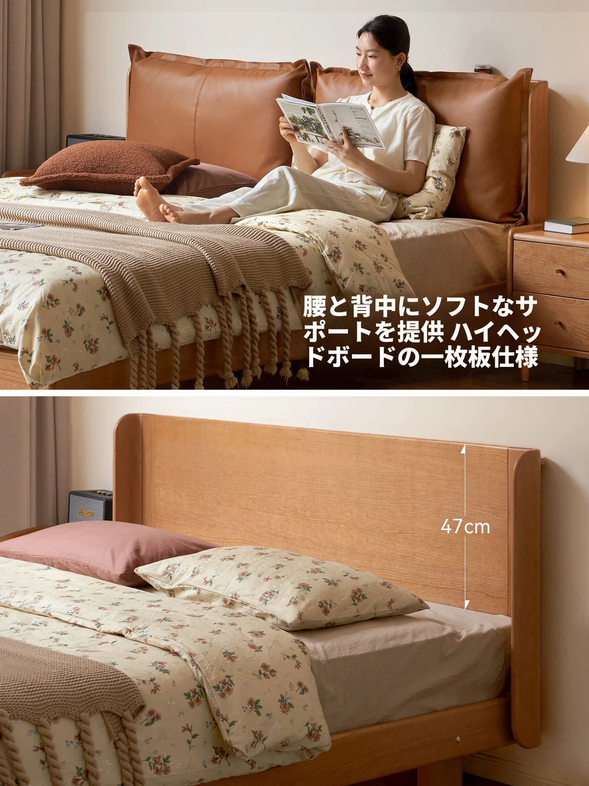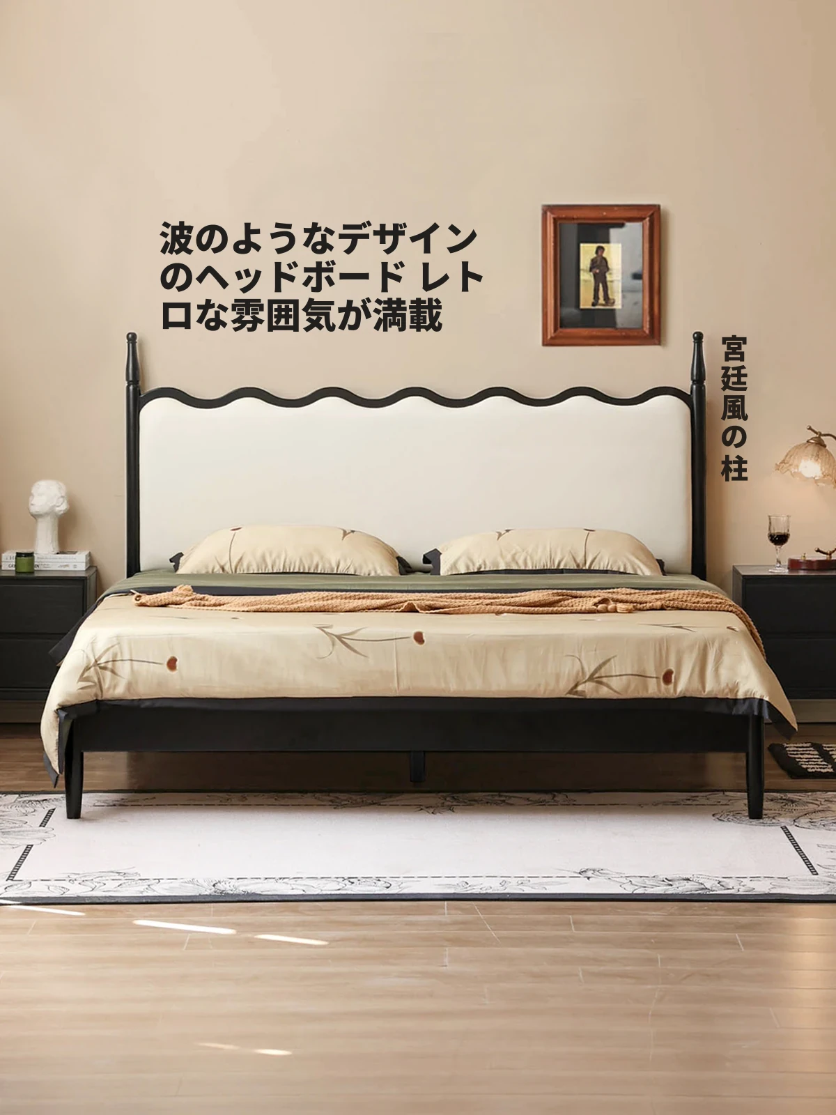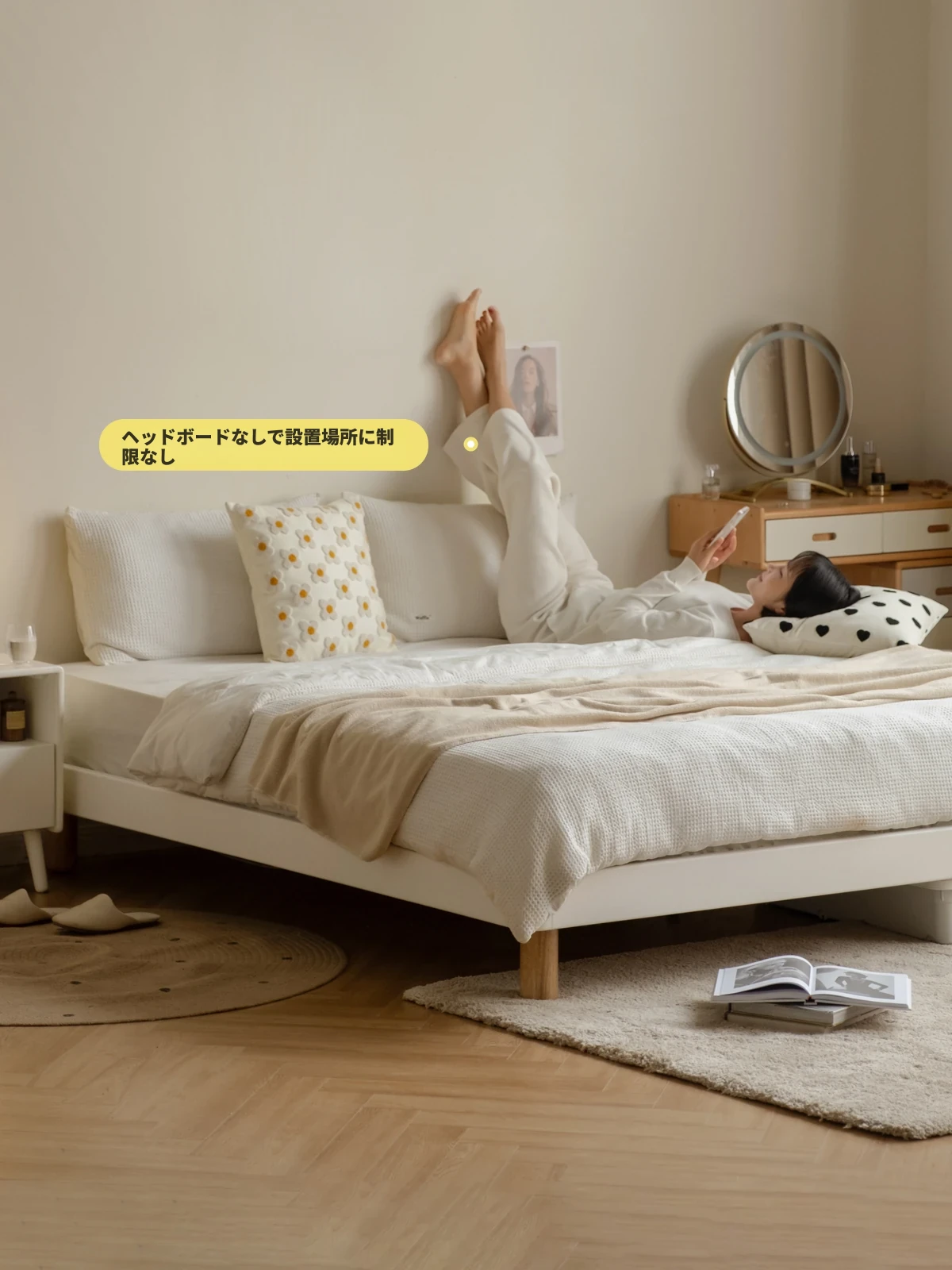 【魅力の木製家具】ゲンジモクユーxヴィサ純天然無垢材ベッド - クリームホワイトのハープ風デザインで、エレガントなお部屋にぴったり!快適なハープ型ソフト背もたれ付きで、主寝室に特別な安らぎを。